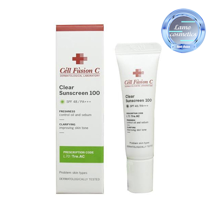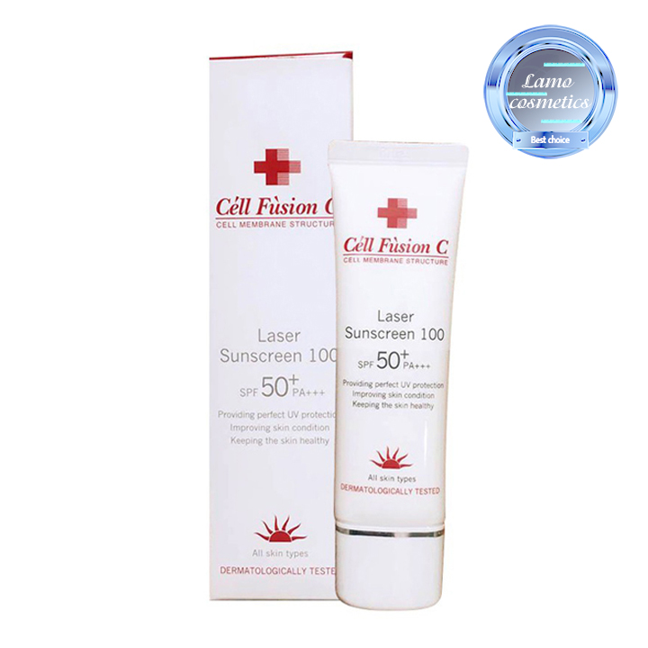 - Kem Chống Nắng Cell Fusion C Sunscreen 100 SPF PA50+++ là một trong những dòng kem chống nắng thực sự tốt cho da, được các bác sỹ da liễu Hàn Quốc khuyên dùng bởi độ lành tính, không gây kích ứng và bảo vệ da tuyệt đối kể cả các làn da nhạy cảm, bị tổn thương, sau điều trị laser, peeling. Một số nữ diễn viên nổi tiếng của Hàn cũng bật mí rằng kem chống nắng Laser Sunscreen 100 của CELL FUSION C là bí kíp để họ có làn da khỏe đẹp.