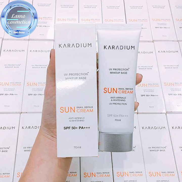 - Karadium là kem chống nắng da mặt và toàn thân, bảo vệ da khỏi các tác hại xấu của ánh nắng với SPF50+, PA+++ chống tia UVA và tia UVB xâm nhập vào làn da của bạn- Kem Chống Nắng Karadium làm sáng da, che phủ vết thâm và đốm đỏ trên da, hiệu chỉnh màu cho da khiến da sáng mịn hơn. Kem chống nắng dành cho cả da dầu và da khô vì chất thấm hút nhanh chóng không gây bết dính.- Sử dụng Kem Chống Nắng Karadium Snail Repair Sun Cream Spf 50+ PA+++ nhiều giúp lỗ chân lông được thu nhỏ dần lại và da trắng lên sau 1 thời gian sử dụng. Kem Chống Nắng Karadium Snail Repair Sun Cream Spf 50+ PA+++ bảo vệ da mà không quên dưỡng. - Kem Chống Nắng Karadium Snail Repair Sun Cream Spf 50+ PA+++ siêu chống nước, đây là một điểm cộng nữa cho sản phẩm này.- Không chỉ vậy Kem Chống Nắng Karadium Snail Repair Sun Cream Spf 50+ PA+++ còn là bước dưỡng da trang điểm hoàn hảo cho mặt và body mà mọi cô gái đều mong muốn. Kem chống nắng Karadium cực kì thích hơp cho việc đi shoping, party ngoài trời.- Thoa kem chống nắng Karadium lên vùng da bạn cần làm sáng để tạo điểm nhấn.Đọc đến đây, chắn hẳn các cô nàng xinh đẹp của Lamo Cosmetics đã chọn được loại kem chống nắng cho da mặt và toàn thân tốt nhất cho mình rồi đúng không nào!!!