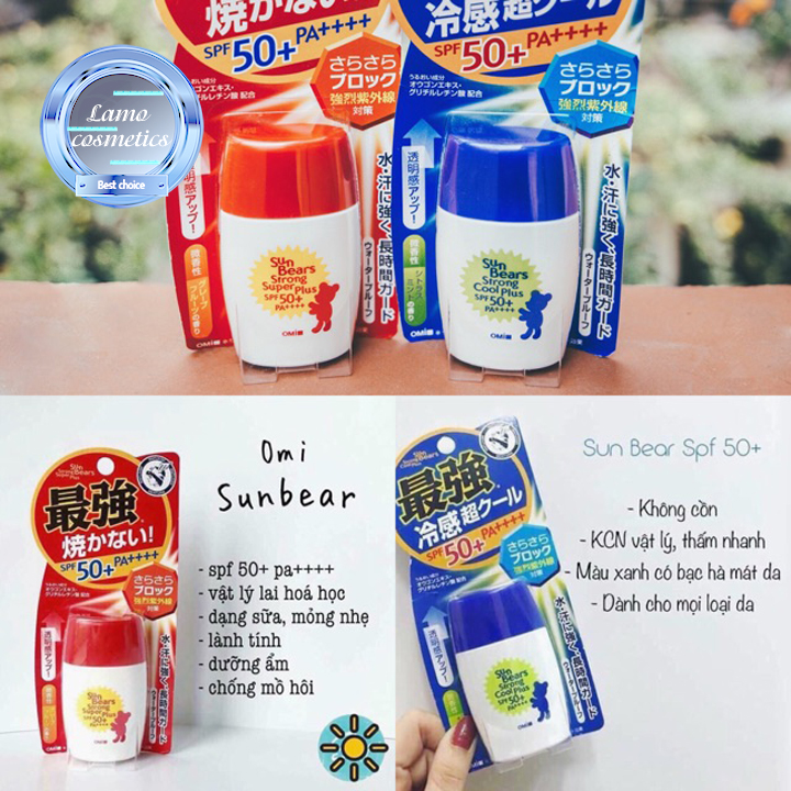 - Omi Sun là kem chống nắng da mặt và toàn thân, bảo vệ da khỏi các tác hại xấu của ánh nắng với SPF50+,PA+++ chống tia UVA và tia UVB xâm nhập vào làn da của bạn- Kem Chống Nắng Omi Sun làm mát da, làm sáng da, che phủ vết thâm và đốm đỏ trên da, hiệu chỉnh màu cho da khiến da sáng mịn hơn. Kem chống nắng dành cho cả da dầu và da khô vì chất thấm hút nhanh chóng không gây bết dính.- Sử dụng Kem Chống Nắng Omi Sun Bears SPF50+ PA++++ nhiều giúp lỗ chân lông được thu nhỏ dần lại và da trắng lên sau 1 thời gian sử dụng. Kem Chống Nắng Omi Sun Bears SPF50+ PA++++ bảo vệ da mà không quên dưỡng. - Kem Chống Nắng Omi Sun Bears SPF50+ PA++++ siêu chống nước, đây là một điểm cộng nữa cho sản phẩm này.- Không chỉ vậy Kem Chống Nắng Omi Sun Bears SPF50+ PA++++ còn là bước dưỡng da trang điểm hoàn hảo cho mặt và body mà mọi cô gái đều mong muốn. Kem chống nắng Ice Sun cực kì thích hơp cho việc đi shoping, party ngoài trời.- Thoa kem chống nắng Omi Sun lên vùng da bạn cần làm sáng để tạo điểm nhấn.Đọc đến đây, chắn hẳn các cô nàng xinh đẹp của Lamo Cosmetics đã chọn được loại kem chống nắng cho da mặt và toàn thân tốt nhất cho mình rồi đúng không nào!!!