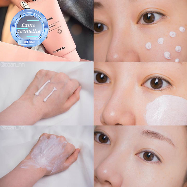 - Thoa kem chống nắng The Saem lên vùng da bạn cần làm sáng để tạo điểm nhấn.