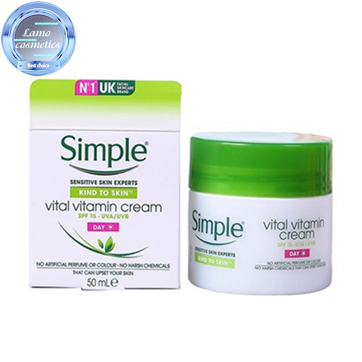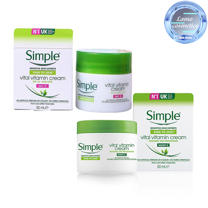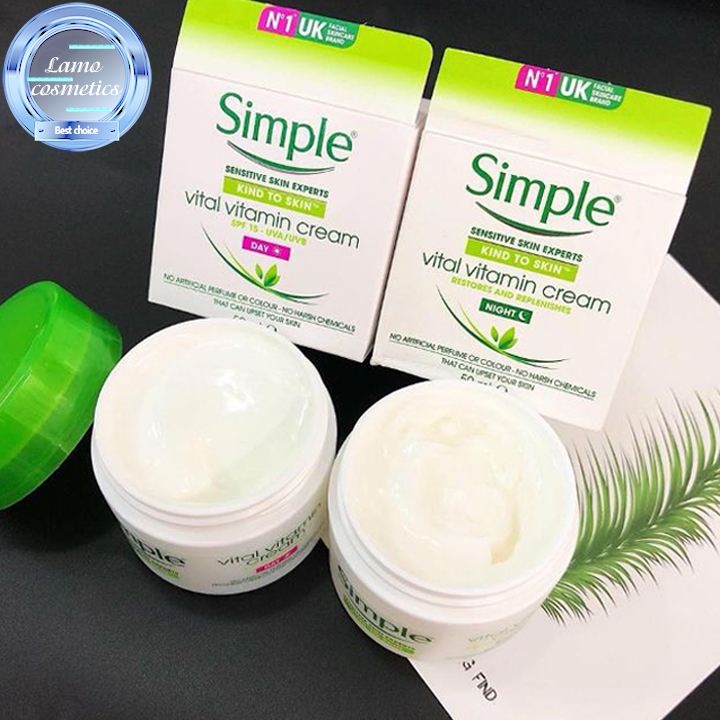 SIMPLE- hãng mĩ phẩm UK chuyên về các dòng sản phẩm chăm sóc da với mục tiêu hướng đến mọi loại da, kể cả những làn da nhạy cảm, vẫn sẽ phù hợp với tất cả các sản phẩm của hãng. Chính vì vậy nếu bạn vẫn còn chưa biết da bạn thích hợp với loại sản phẩm nào thì nên lựa chọn Kem dưỡng da Simple Vital Vitamin của hãng. Đây là một sản phẩm dưỡng da dịu nhẹ, lành tính nhưng lại mang đến cho làn da bạn sự mềm mịn và tươi tắn đến không ngờ. Simple Vital Vitamin được phân ra thành 2 dòng kem dưỡng dành cho ngày và đêm để mỗi em này đều thực hiện tốt chức năng riêng của mình.