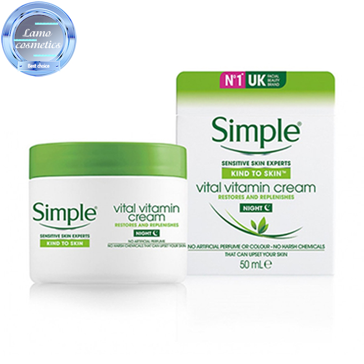 Đúng như tên gọi của mình, Kem Dưỡng Da Ban Đêm Simple Kind To Skin Vital Vitamin Night Cream này được ra đời để dưỡng trắng,cấp ẩm sâu cho da vào ban đêm và làm phục hồi da toàn diện. – Kem Kind To Skin Vital Vitamin Night Cream chứa những thành phần từ thiên nhiên tốt cho da như Pro – Vitamin B5, Vitamin E, Vitamin F… làm cho da phục hồi và tái tạo trong khi ngủ. Đọc đến đây, chắn hẳn các cô nàng xinh đẹp của Lamo Cosmetics đã lựa chọn được loại kem dưỡng da cho cả ngày và đêm phù hợp nhất với mình rồi đúng không nào!!!