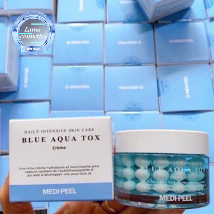 - Kem Dưỡng Trắng Da Medi-Peel Blue Aqua Tox Cream giúp tái tạo da, làm mờ thâm sẹo, sần sùi do mụn gây ra và thu hẹp lỗ chân lông