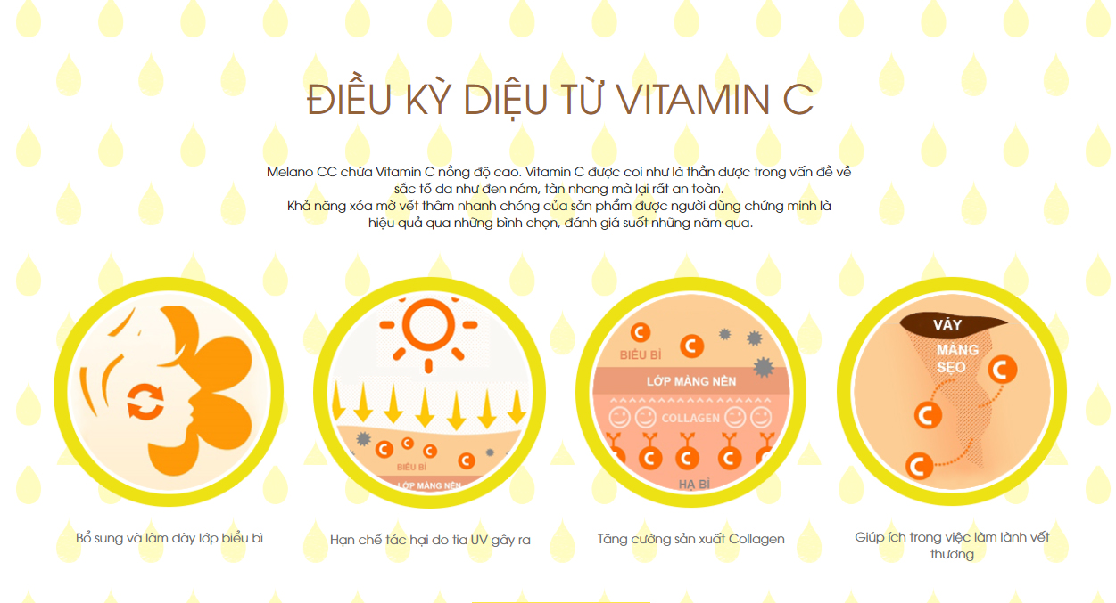 - Thành phần của mặt nạ Melano CC chủ yếu là hai loại Vitamin C và E – có khả năng thâm nhập sâu vào lớp sừng giúp ức chế sự sản xuất melanin (tác nhân gây ra vết thâm nám, tàn nhang), làm mờ vết thâm, tàn nhang, nám nhẹ, đều màu da hiệu quả, đồng thời thúc đẩy lưu thông máu.