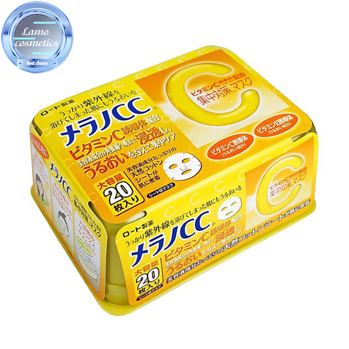 - Rohto Melano CC Intensive Measures Mask được đóng gói thành hộp, mỗi hộp chứa 20 miếng mask giấy, chất liệu 100% cotton mềm mại, thân thiện với làn da.