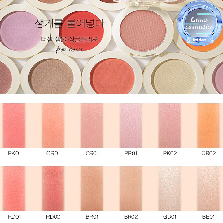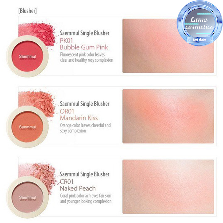 - The Saem Single Blusher sở hữu những tone màu mắt nổi bật, phù hợp với nhiều loại phong cách trang điểm, tạo nên lớp trang điểm hoàn hảo. Hiện tại Lamo Cosmetics đang có 3 tone màu hot hit nhất đó là :
