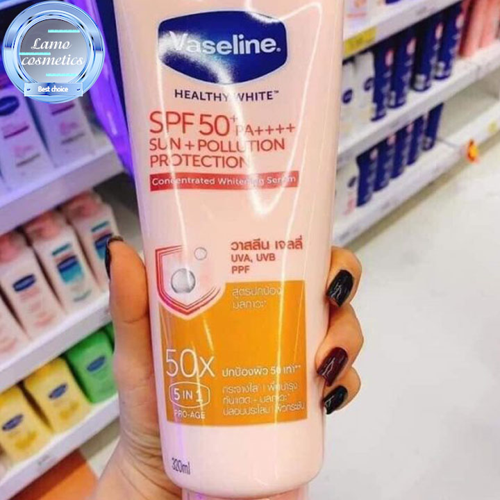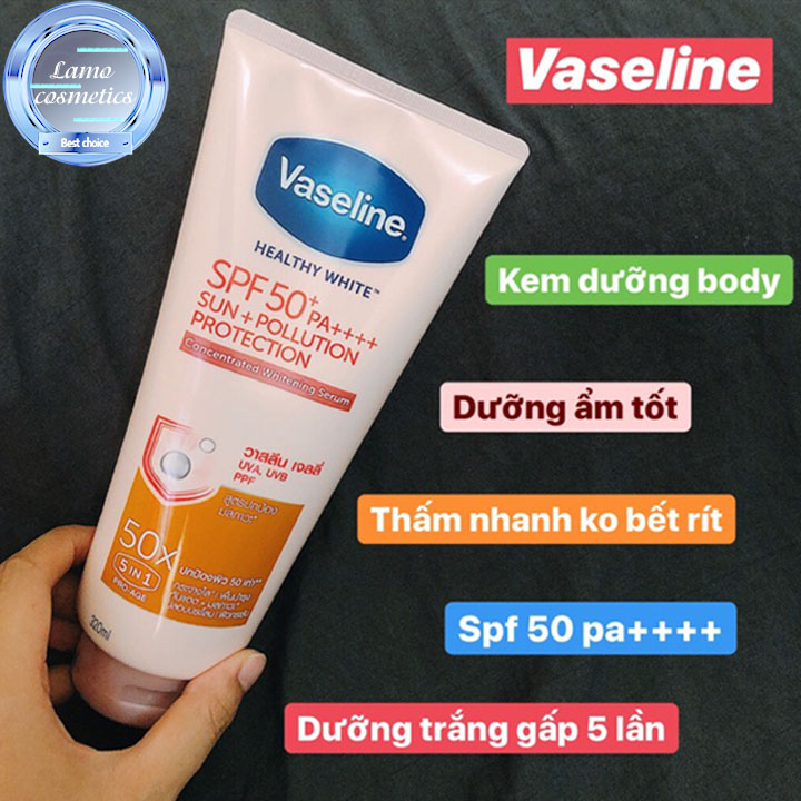 - Sữa dưỡng thể Vaseline 50X SPF 50+ PA++++ được tích hợp cùng lúc nhiều chức năng bên trong một chất kem, mang đến tác dụng dưỡng trắng gấp 50 lần so với các dòng dưỡng Vaseline thường. Vaseline Healthy White 50X với công thức giàu hàm lượng Vitamin B3 giúp dưỡng trắng da,làm đều màu da, giảm vết thâm mang lại cho bạn làn da trắng sáng rực rỡ, da nhanh chóng lên tone và mịn màng.
