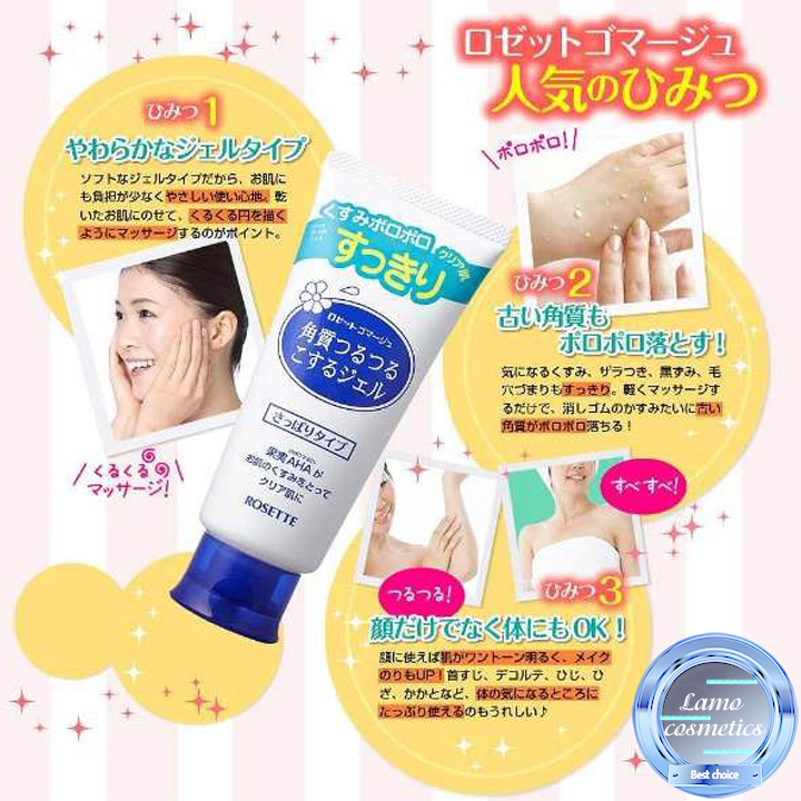 - Tẩy Da Chết Rosette dạng gel khi massage sẽ vón lại – đóng vai trò như các hạt dẻo scrub nhẹ không làm tổn thương cho da.